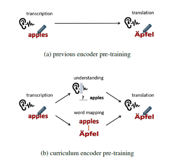 端到端语音翻译(Speech Translation, ST)利用一个神经网络模型将一段源语言语音直接翻译为目标语言的文本。这个任务对模型编码器带来很大负担,因为它需要同时学习语音转录(transcription)、语义理解(understanding)和跨语言语义匹配(mapping)。已有工作利用语音识别(Automatic Speech Recognition, ASR)数据上进行预训练以获得更强大的编码器。然而,这种预训练方式无法学习翻译任务所需要的语义知识。受到人类学习过程的启发,本文提出了一种课程预训练(Curriculum Pretraining)的方式。如图1所示,在学习语音翻译之前,模型首先学习一门基础课程用于语音转录,随后学习两门用于语义理解和单词映射的高级课程,这些课程的难度逐渐增加。