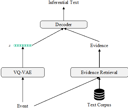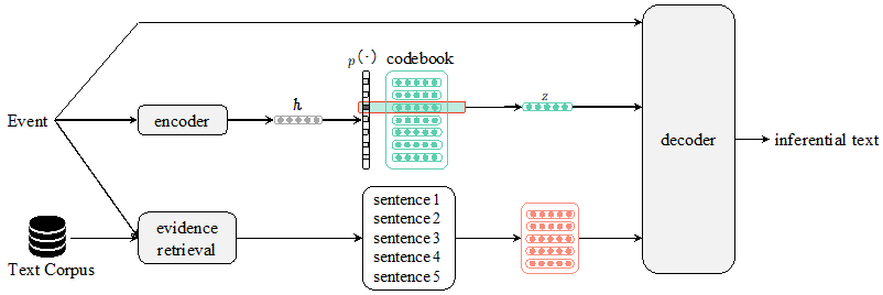 在本文中,我们提出了一种面向证据的推理文本生成的方法(EA-VQ-VAE),从语料库中自动寻找有用的背景知识,用来帮助模型的生成。整体框架上图所示。给定一个事件 Event,首先通过量子变分自编码器(VQ-VAE)得到具有语义信息的离散潜变量 z,然后从一个大规模的语料库中寻找包含事件和该事件上下文的证据。最后解码器利用具有该事件语义信息的潜变量 z 选择语义相关的证据作为背景知识,从而指导推理文本的生成。