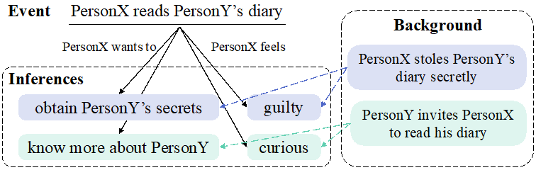上图给出了该任务的一个具体例子,给定一个事件,该任务主要生成合理的推理文本,如事件的原因和结果等知识。从上述的例子可以看出,对于同一事件,在不同的背景下,参与者心理的状态也是不一样的。因此,背景知识在该任务中提供了重要的线索,可以帮助我们推断出合理的文本并且能够在不同背景知识下从多个角度进行推理,但值得注意的是在当前的数据集中背景知识并不存在。