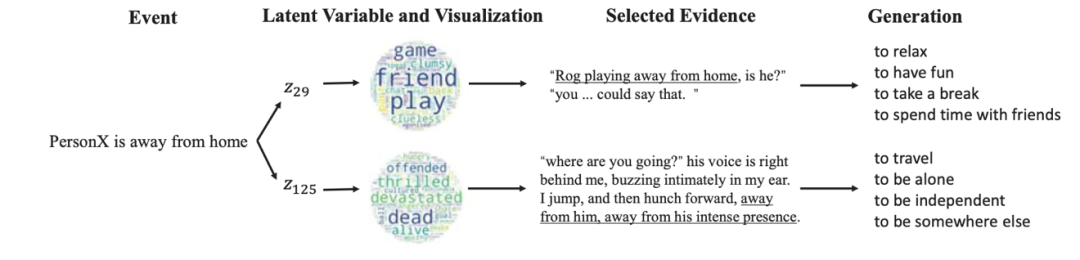 通过样例分析可以看出,该模型能够描述推理的过程。如下图所示,给定一个事件 “PersonX 离开家”,该模型首先通过 VQ-VAE 得到两个潜变量 z_29 和 z_125。然后通过在同一潜变量赋值下的文本进行词云化能够可视化潜变量的语义。可以看出 z_29 捕捉到积极的语义,如 “play” 和 “friend”。最后根据该语义找到相近的上下文,从而指导文本生成。