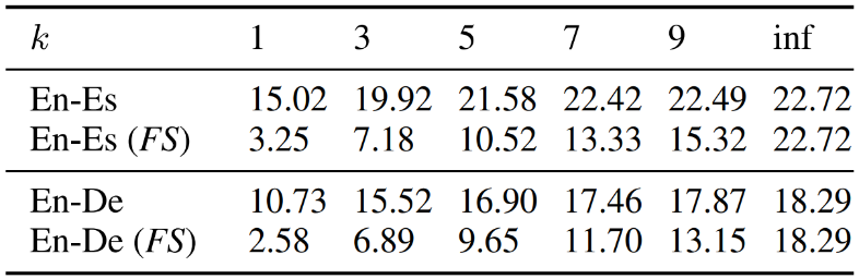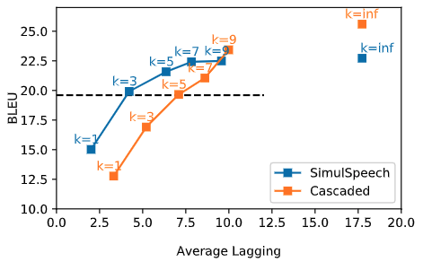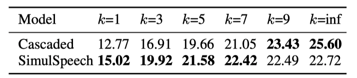 表1:SimulSpeech 在不同 k 下的 BLEU 分数比较。FS 代表使用整句训练(即不使用 wait-k 策略)的模型