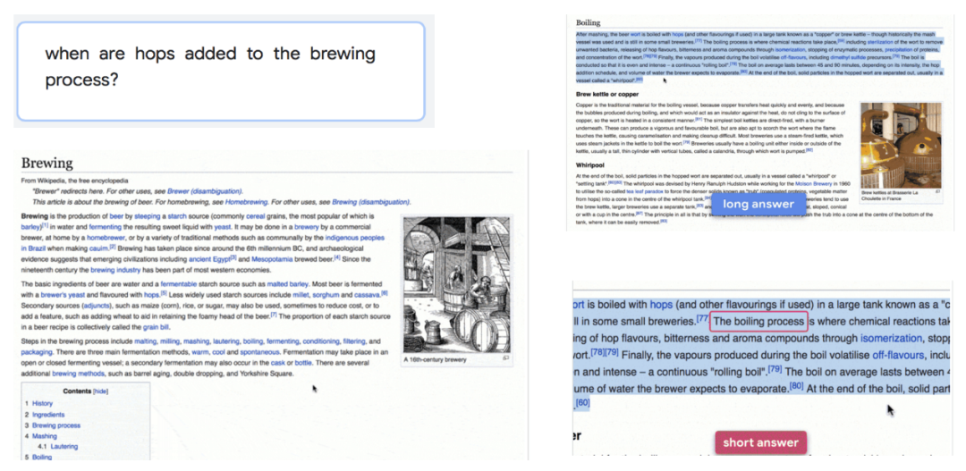 随着机器阅读理解模型和问答模型的发展,越来越多的模型性能在多个数据集上超过了人类。Google Natural Question(NQ)于19年被提出,为开放域问答提出了新的挑战。如图13所示,该任务给定一个用户在 Google 搜索引擎中输入的自然问题,以及与该问题最匹配的维基百科页面,要求模型预测出回答该问题的长答案(即该页面中的某一个段落)和短答案(即某一个 answer span),以及是否存在长答案或短答案。
