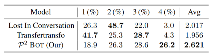 在个性化对话生成数据集 Persona-Chat 上,我们的模型在 PPL(困惑度)和 F1 指标中都取得了比基线模型更好的结果,在后续的人工评测中也取得了最好的效果。值得注意的是,Lost in Conversation 和 Transfertransfo 也是基于 GPT 来生成对话,它们与我们模型的区别在于它们没有引入相互个性感知。