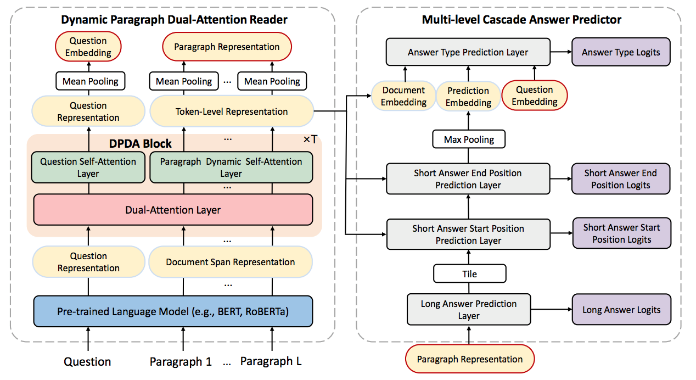 如图14所示,RikiNet 模型由两部分组成:(1)动态的段落双重注意力阅读器(Dynamic Paragraph Dual-attention Reader, DPDA reader),通过利用一系列互补的注意力机制和预训练语言模型对文档和问句进行编码,以得到上下文相关的问句表示,token-level 和 paragraph-level 的文档表示;(2)多层级的级联答案预测器(Multi-level Cascaded Answer Predictor,MCAP),利用 DPDR 输出的多层级表示,以级联的结构依次预测长答案、短答案和答案类型。