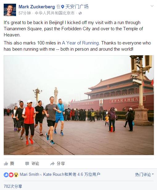 星期五(2016年3月18日)上午,小扎在Facebook上发了条信息,地理位置是天安门广场,配的图片是他在天安门城楼前跑步。