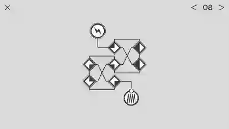 你会觉得,Electronia 简直是 Hook 二代,因为它们不论风格还是玩法都非常类似。Electronia 也是简朴的米黄色背景,屏幕上线条和简笔画勾勒出一个个谜题,正如游戏名所传达的意思,这些谜题和电路有关。带有闪电的圆环是电源阴极,它会发射一颗电子,电子顺利经过一系列开关到达终点,灯泡就能点亮。你的任务就是调整好开关的方向,让电子能够顺利通过。