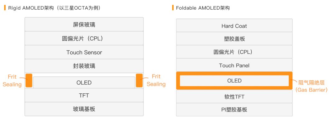 在硬式 AMOLED 面板的构造中,AMOLED 上下方有玻璃,可以阻隔水气及氧气的穿透,AMOLED 侧边的空隙就使用 Frit Sealing,为一种可熔融玻璃,通过激光的方式把 Frit Sealing 与 AMOLED 的侧边和上下两片玻璃熔融在一起,通过把 AMLOED 完全保护起来的方法,阻隔水气及氧气以防止对元件的伤害。