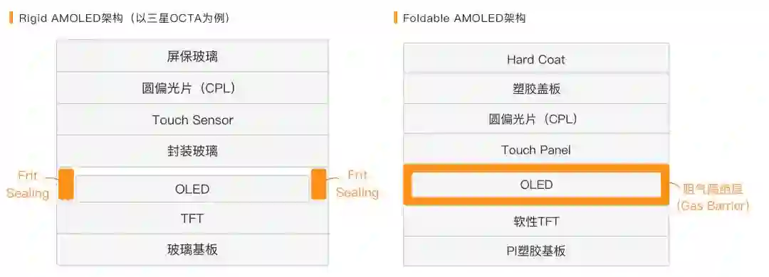 下方左图为 Rigid AMOLED(以三星 OCTA 架构为例),右图为 Foldable AMOLED。
