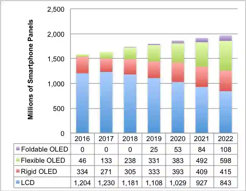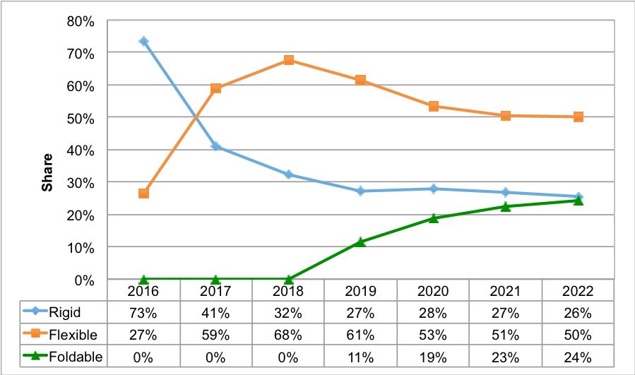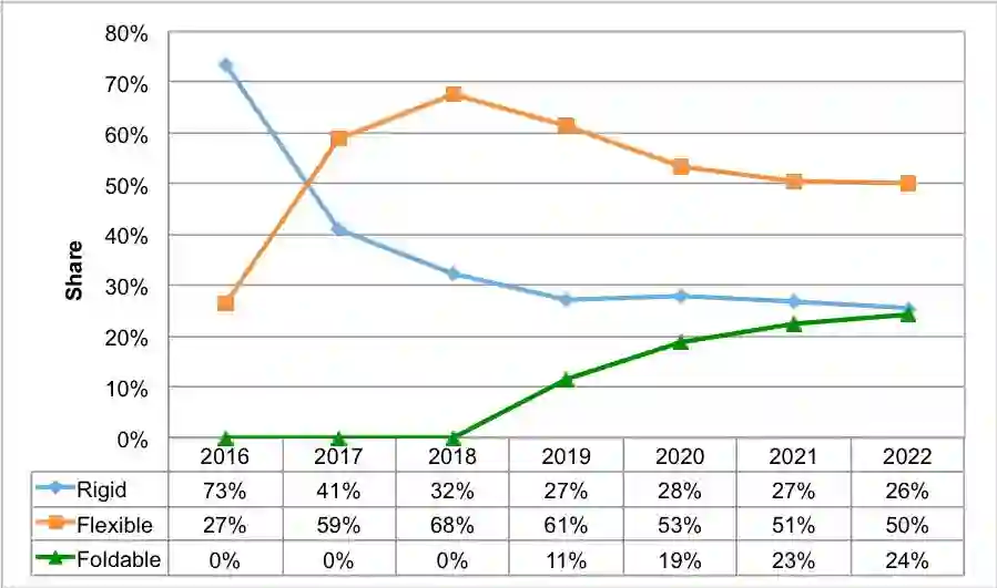 图|硬式、可挠式、可折叠式面板成长性(图片来源:DSCC)