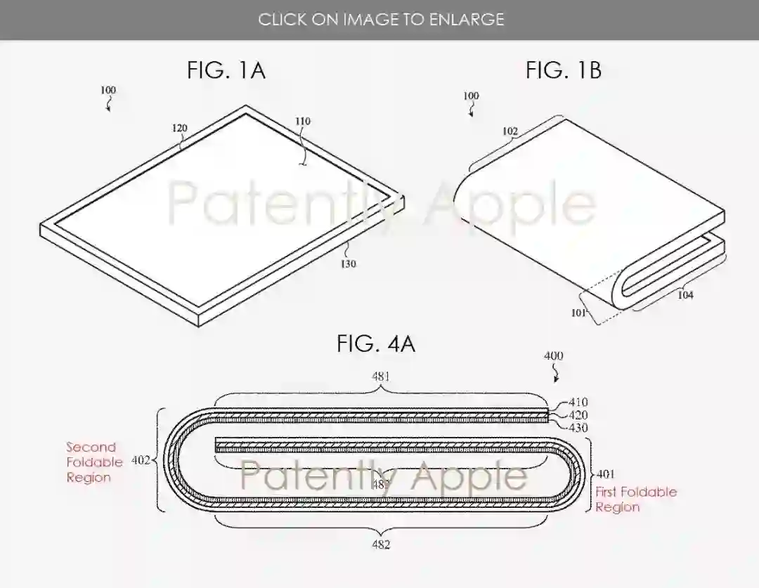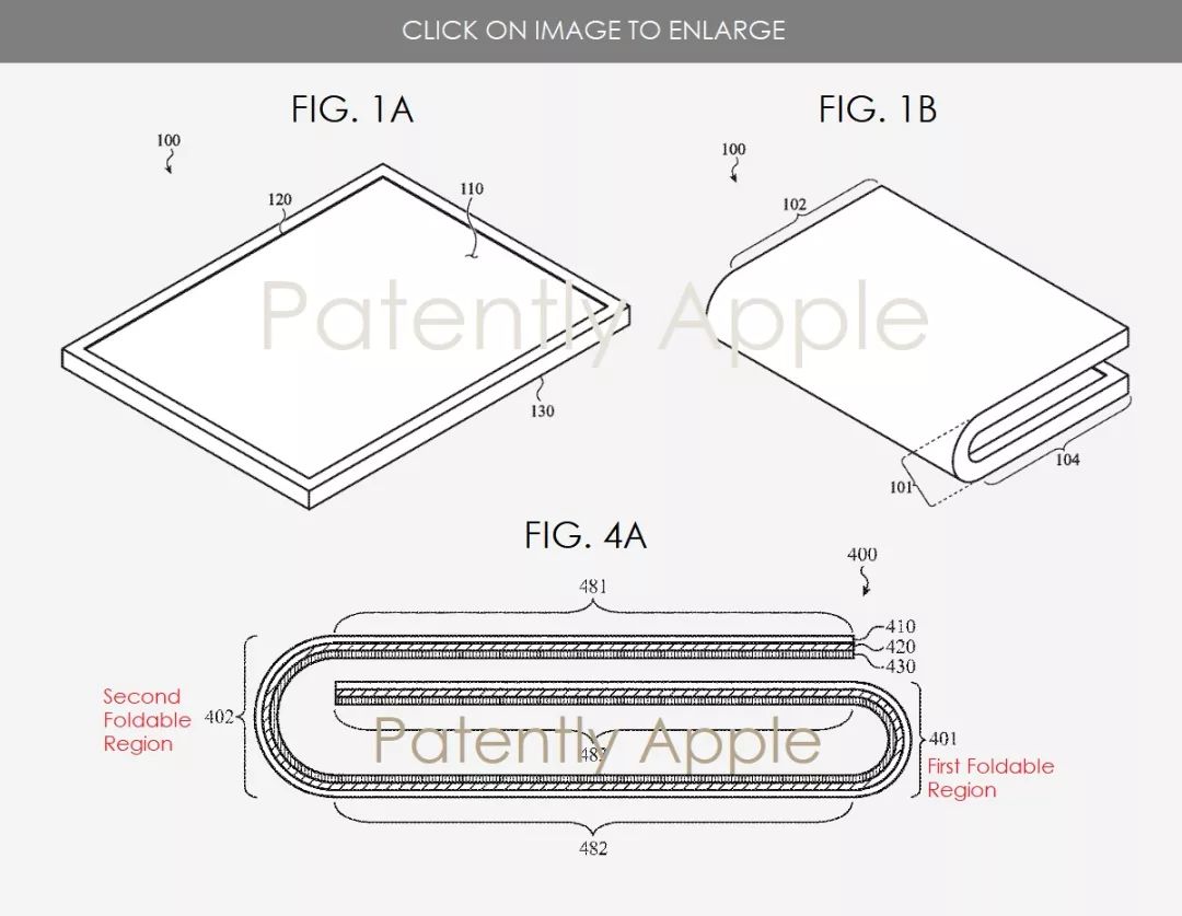 图|苹果申请了不少关于可折叠屏幕技术的专利(图片来源:www.patentlyapple.com)