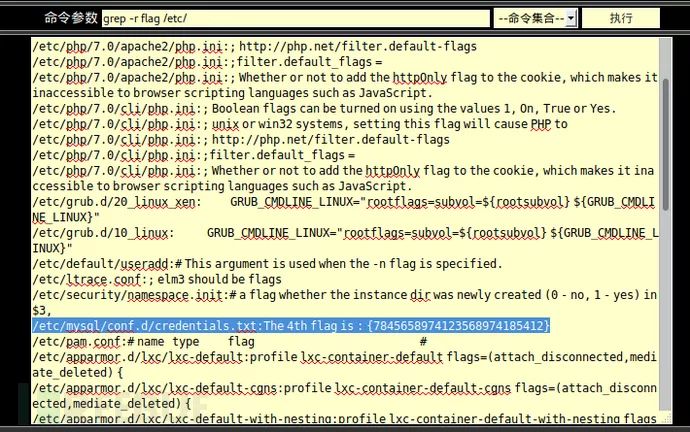 “grep -r flag /etc/“ 得到文件路径、flag、账号密码