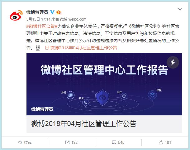 昨日,据微博管理员消息,为落实企业主体责任,严格贯彻执行《微博社区公约》等社区管理规则中关于时政有害信息、违法信息、不实信息,及用户纠纷和垃圾信息的规定,对微博内存在的违规违法内容进行清查处置。