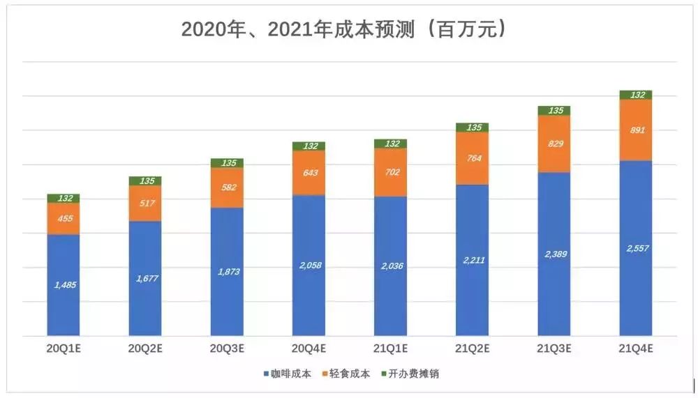 由于规模效益,假设2020年每杯成本降至11元,2021年降到10元。2020年、2021年总成本227亿元,毛利润65.5亿元。