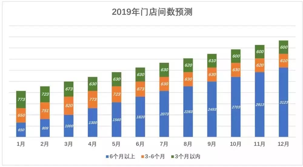 假设上半年每月新开210间,下半年每月新开200间,全年新开2460间,2019年末门店数4533间。