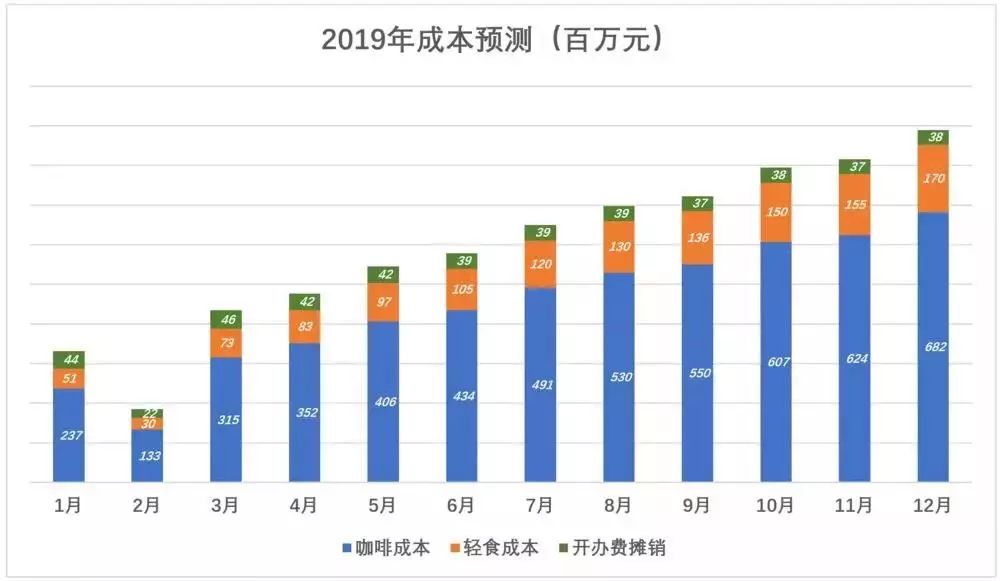 瑞幸咖啡主要成本包括咖啡(包括食材、房租、人工等),轻食成本及门店开办费摊销。2019年,三大成本分别为53.6亿、13亿和4.63亿,共计48.06亿元,毛利润近9.3亿。