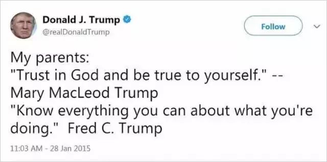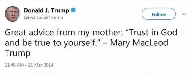 特朗普也把他妈的人生信条常常挂在嘴边:相信上帝、忠于自己