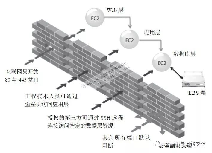 这张图源于AWS对云平台的securitygroup(安全组,相当于3层的防火墙ACL)功能的举例描述。其中Web层是直接在互联网上暴露给用户的,而应用层不需要直接暴露在互联网上,它只需要接受Web的请求,以及能访问位于更靠后一层的数据库层,数据库层则只需要接受来自应用层的请求,同时自己的I/O来自于EBS卷,默认这些服务器都需要接受管理员的SSH连接,但管理员并非从互联网直接发起连接,而是先登录到堡垒主机或统一的运维跳板机,由此再发起向Web层、应用层、数据库层的各SSH连接,如果是使用自动化运维工具的场景,则3层的服务器要接受来自运维管理平台(例如Puppet、SaltStack服务端)的连接,这样每层只对外开放最小端口,除必要的协议外默认全部阻止访问。