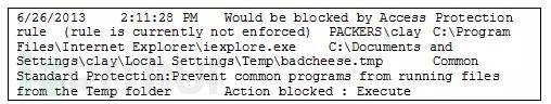 除此之外,基于主机的IPS或反病毒产品日志同样可以表明一个文件是否执行过,或者曾经尝试执行过。下图给出的是McAfee Access Protection日志中记录下的一次访问事件样本: