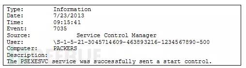 为了确定一个文件是否执行过,我们还可以根据日志文件的分析结果来判断。首先我们来看一看Windows System Event Log(系统事件日志),因为这个日志文件记录了服务的启动信息。下图显示的事件(Event ID=”7035″)信息表明,一个管理员(SID=”-500″)运行了PSEXECSVC远程执行服务:
