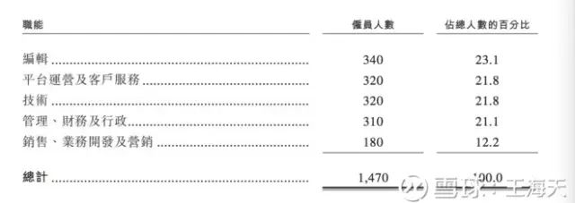最后,附一张阅文的员工数量和占比。人员最多的是编辑。一家年收入20亿的公司,只有1400人,上市的话,每个人拿的股票应该很爽。。