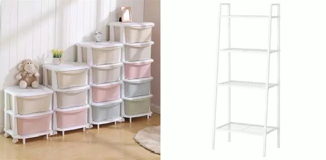 左:可以随意组合跌价的抽屉柜;右:置物架。两者的共同特点都是占地面积小、充分利用垂直空间