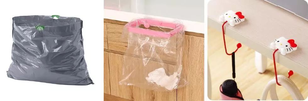 左:抽绳式垃圾袋;中:吸盘式垃圾架;右:桌边挂钩