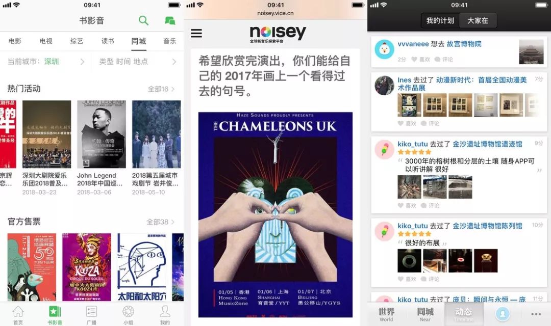 豆瓣同城:基本上国内的每一个城市都涵盖了,活动的种类也非常丰富,音乐类活动的资讯也非常丰富和及时,小众或大众的歌手 Live 资讯都可以在这里找到。