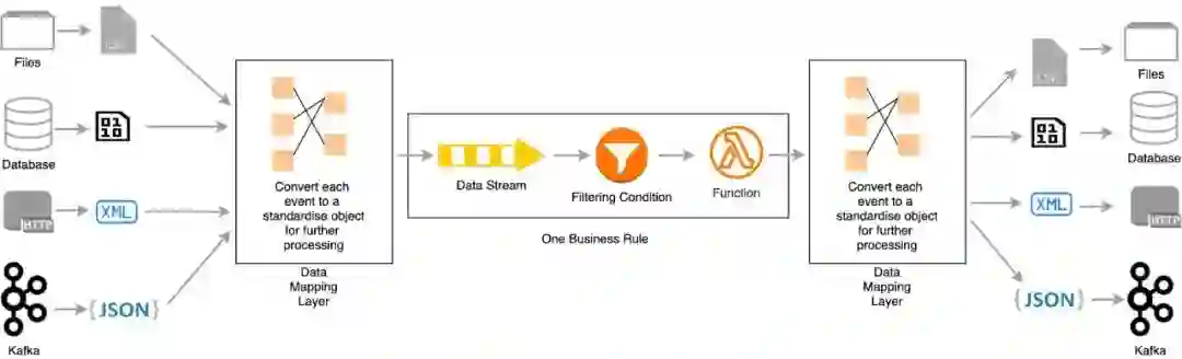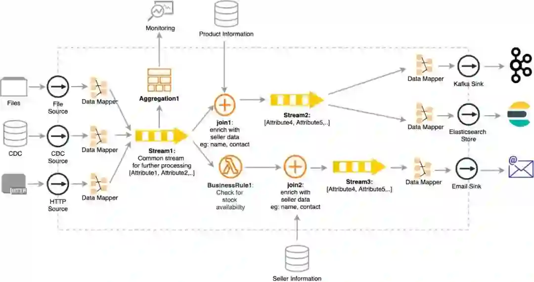 源(例如文件、CDC、HTTP)和目标端点(如Kafka、Elasticsearch、Email)从处理过程中解耦合: