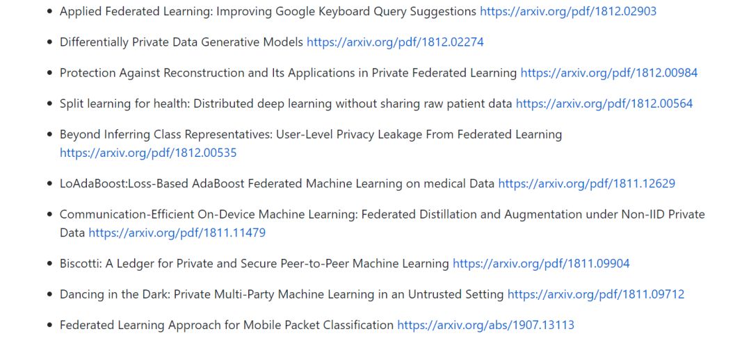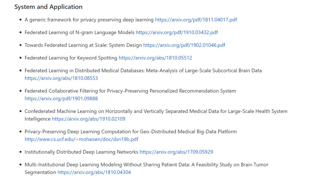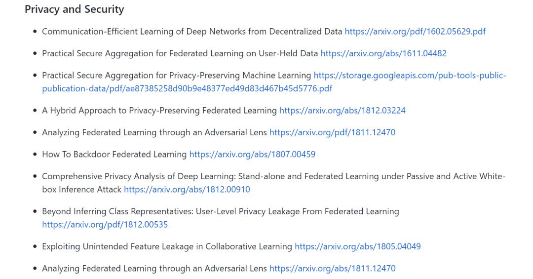 本资源整理了与机器学习中的联合学习和隐私相关的资源列表。包括相关论文、代码以及案例。