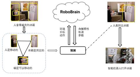 此外,也存在一些专门的针对智能机器人的知识引擎。其中具有代表性的是RoboBrain[21] 。RoboBrain是斯坦福大学和康奈尔大学为机器人定制的知识引擎项目。机器人系统涉及的数据模态多样(包括符号、语言、语音、图像、视频以及轨迹等等),机器人需要从事的任务多样(包括感知、规划、控制、决策等等)。因此,面向机器人的知识引擎必须能够将多模态多任务的知识统一表示。RoboBrain知识引擎采用图统一表达各种知识。RoboBrain除了存储了来自互联网的多个来源的公开知识库(包括前面提及的百科图谱、语言知识库、图像知识库等),还通过学习模型习得机器与物理环境进行交互的知识。知识引擎主要实现知识的获取、解析、存储以及推理功能,并提供查询语言RQL(Robot Query Language)供第三方平台使用知识。RoboBrain能够帮助机器理解人类活动并采取相应行动。比如图2所示,RoboBrain通过“冰箱是固定的”,“人、碗是活动的”等常识知识预测人将拿着碗走向冰箱,此时智能机器人就可以为人类打开冰箱。