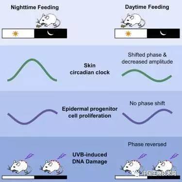 而只在夜间进食的小鼠并没有出现XPA周期改变的情况,它们也更不容易受到日间紫外线辐射的影响。
