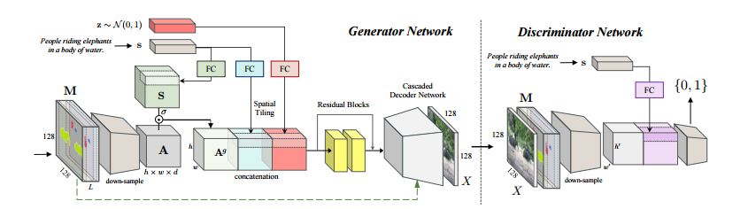 本文所提出算法的总体框架。给定一个文本描述,我们的算法序列性地构造一个场景的语义结构,并生成一个基于推断布局和文本的图像。可以根据标注的颜色进行查看。