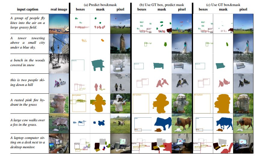 使用我们方法的图像生成结果。每列对应于根据(a)预测的边框和掩码布局,(b)对照标准边框和预测的掩码布局和(c)对照标准边框和掩码布局所生成的结果。处于说明的目的,类是颜色编码的。