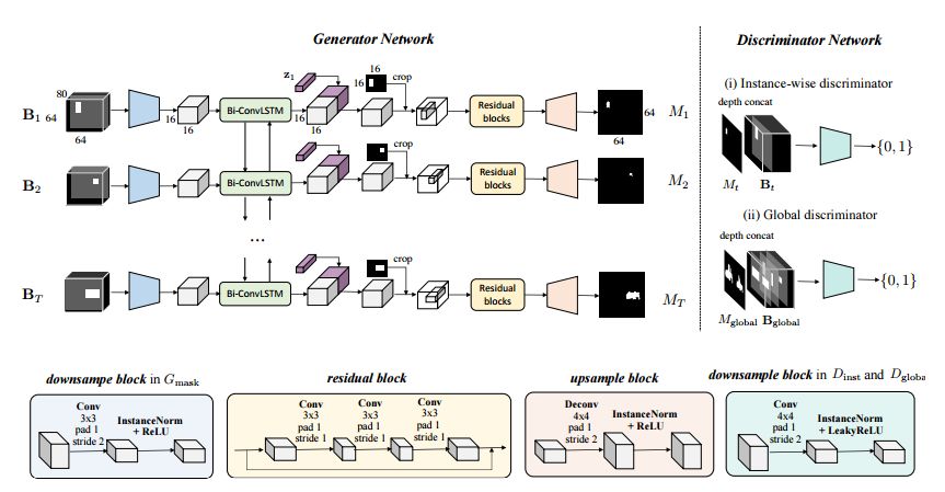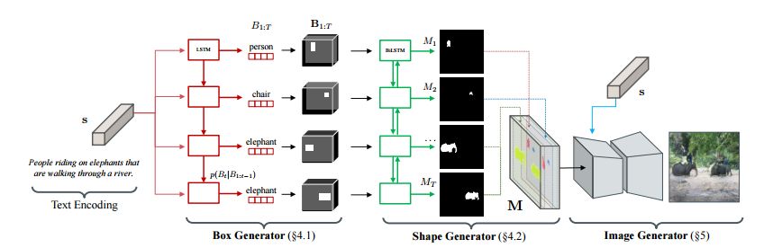 本文所提出算法的总体流水线。给定一个文本嵌入,我们的算法首先通过使用边框生成器放置一组目标边界框以生成一个粗略的布局,并使用形状生成器进一步细化每个边框内的目标形状。将边框生成器和形状生成器的输出结合起来,就形成了一个定义场景语义结构的语义标签映射。根据推断的语义布局和文本,图像生成器最终生成了一个像素级的图像。