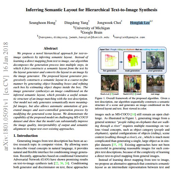 然而,对于现有方法来说,它们的成功主要局限于诸如鸟类和花朵等这些简单的数据集,而像MS-COCO这样复杂的、真实图像的生成,对于它们来说仍然是一个很大的、公开性的挑战。如图1所示,从“人们骑在大象身上穿过一条河(people riding on elephants that are walking through a river)”这样的通用句子中生成图像,需要对各种视觉概念进行多种推理,诸如目标类别(人和大象)、目标的空间配置(骑着),场景环境(穿过一条河流)等等,这远比在较简单的数据集中生成单一的、大型的目标要复杂得多。现有的方法在为这种复杂的文本描述生成合理的图像方面还没有取得成功,因为从通用图像中学习一个文本到像素的直接映射是非常复杂的。