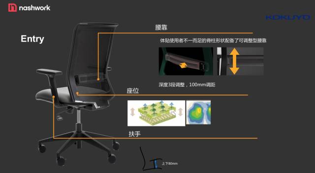 扶手是可以调解的。光是这个功能,市面上有很多产品,但是纳什要求一定是质量达标,这把椅子是国标测试、日本的测试都通过了。正常的国标测试是两万次的现场循环测试,日本的标准是六万次,这个椅子是六万次过的,一般情况下不会坏。