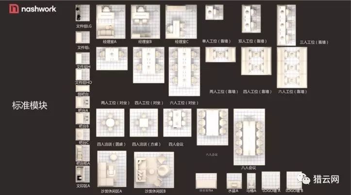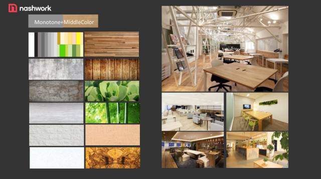 关于风格颜色,每家企业都有自己的主题色,但又各不相同,为了不与企业的主题色相冲突,纳什也是蛮费心,小编看了这组图片后才发现,原来细节这么多。例如适合蓝色主题 logo 的色彩搭配未必适合红色主题 logo ,这显然需要一个中性色来搭,但如果只有灰色、黑色,又很压抑,必须打破,于是在黑白灰基础上加入自然的木头、绿植把空间缓冲一下,形成了叫 Monotone 的风格配置,搭起来的场景颜色自然,又不会跟企业颜色冲突。