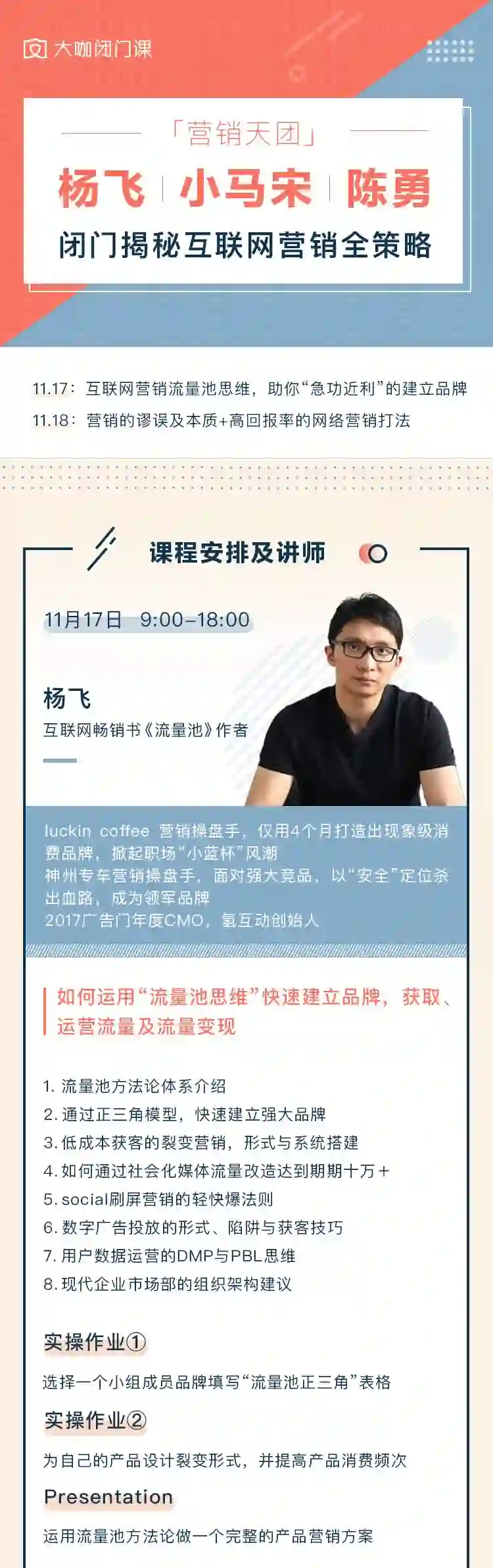 这就是2018年互联网畅销书《流量池》作者,瑞幸咖啡操盘手——杨飞,用3个月时间掀起的“小蓝杯”职场风潮!文中所说只是瑞幸咖啡成功的一部分,对于大部分营销人来说,还有更多的问题亟需解答: