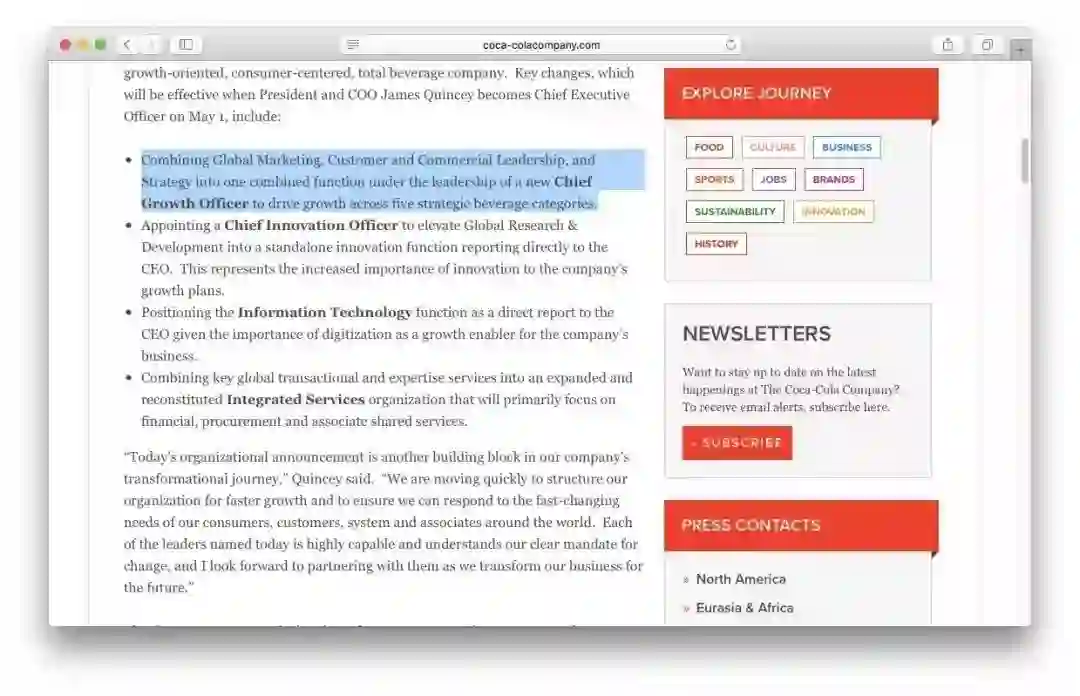 增设首席增长官并非可口可乐一家公司的特例。高露洁、亿滋等快消品巨头都聘请了首席增长官,以实现品牌的快速增长,提升增长在品牌战略中的地位。