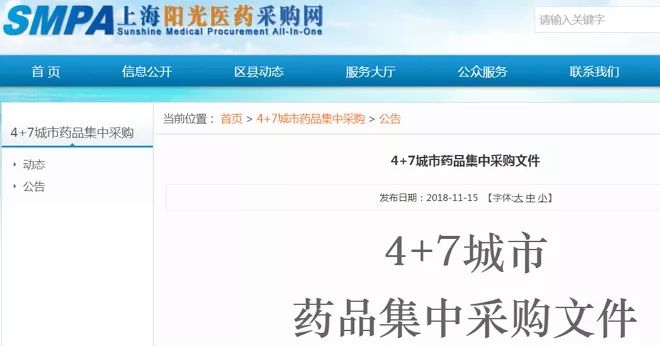 11月15日,上海阳光医药采购网发布《4+7城市药品集中采购文件》,公开了北京、天津、上海、重庆和沈阳、大连、厦门、广州、深圳、成都、西安11个试点城市(以下简称4+7城市)的药品集中采购方案。