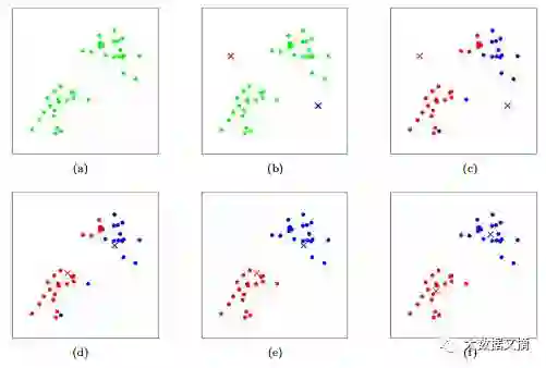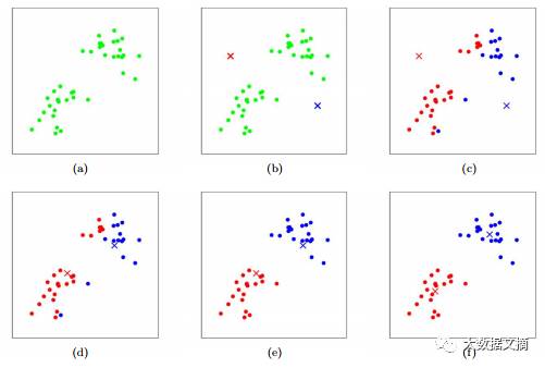 K-均值算法图示-叉表示簇中心,点表示数据点。(a)原始数据集;(b)随机初始簇中心;(c-f)K-均值算法两次迭代的演示。每次迭代中,每个训练点被归为离对应簇中心最近的簇中,之后簇中心被更新为该簇所有点的均值。