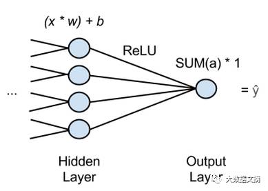 上图中,‘x’ 是输入,上一层传来的特征。许多x会被传入到最后一个隐层的节点上,并且每一个x会乘上对应的权值w。加上一个常数项后,这些乘积的和会进入一个激活函数。激活函数之一是ReLU(线性整流函数),由于不会像Sigmoid激活函数那样在前几层神经网络使得梯度饱和,而被广泛使用。ReLU对每一个隐层节点提供了输出激活函数,所有激活函数相加后进入输出节点。这意味着,一个神经网络进行回归时包含了单一输出节点,该节点的值则是上一层的激活函数输出值之和乘以1。结果是网络的估计。是所有输入x映射到的相关变量。以这种方式使用神经网络,你可以获得你试图预测的从x(一些不相关的变量)到y(相关变量)的函数。