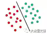 支持向量机是基于定义决策边界的超平面概念。超平面划分了数据集中不同类别的数据点。下图是一个例子。其中,一类物体被标记为绿色,另一类为红。一条边界区分了红色和绿色的物体。任一个落入左边的物体将会被标记为红色,右边的则是绿色。