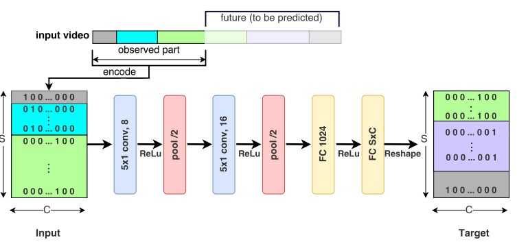 而在CNN系统的结构中,输入序列和输出序列都被转换成矩阵的形式。其中,C表示类(class)的数量,S则对应于特定长度的视频片段的数量。矩阵的二进制值表示每个视频片段的标签。