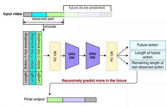 在RNN系统的结构中,输入是一个序列,网络预测最近观察到的动作的剩余长度,以及下一个动作的标签和长度。将预测结果附加到原始输入,就可以预测下一个动作片段。