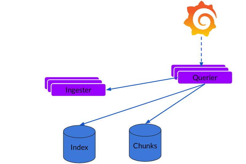 请注意,对于每个查询,单个 Querier 会 grep 所有相关的日志。我们已经在 Cortex 中实现了并行查询,同样的功能可以扩展到 Loki,以便提供分布式 grep,让大型查询变得足够快。