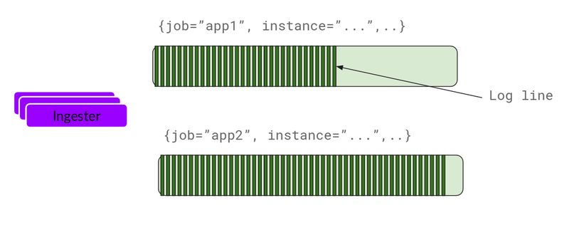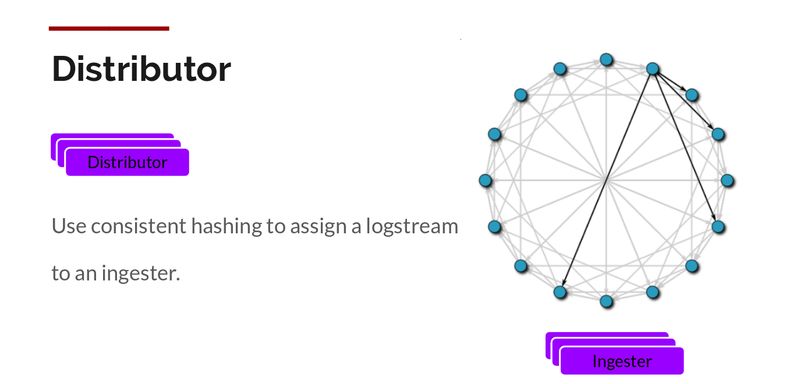 我们通过构建压缩的数据块来实现数据压缩。Ingester 组件是一个负责构建压缩数据库的有状态组件。我们使用了多个 Ingester,属于每个流的日志应该始终在同一个 Ingester 中,这样所有相关条目就会被压缩在同一个数据块中。我们创建了一个 Ingester 环,并使用了一致性散列。当一个条目进入,Distributor 对日志的标签进行散列,然后根据散列值将条目发送给相应的 Ingester。