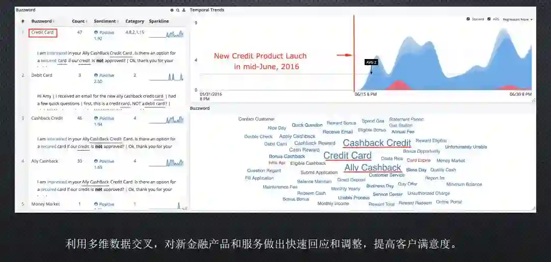 2、敏捷的数据分析流程 - 快速定位客户对金融产品和服务集中咨询的领域:货币市场,储蓄卡,账单支付,电汇转账等。 即时解决客户困扰,优化客户体验。