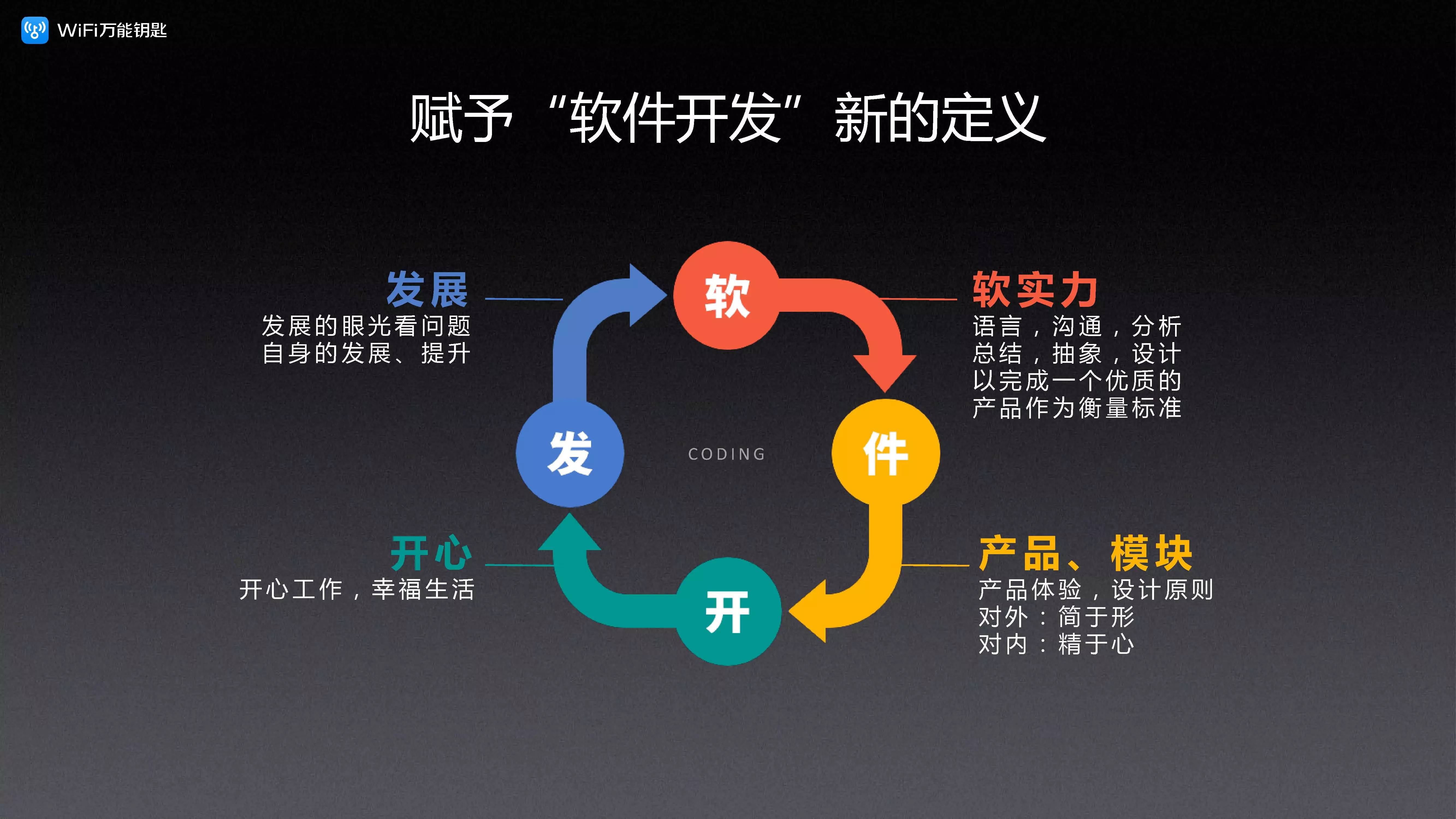 在2014年之前还是作为一名普通研发人员进入到WiFi万能钥匙,到了2015年的时候我的角色有所转变,把公司所有的系统做了整体架构的优化。在这个过程中我对“软件开发”赋予了一个新的定义: