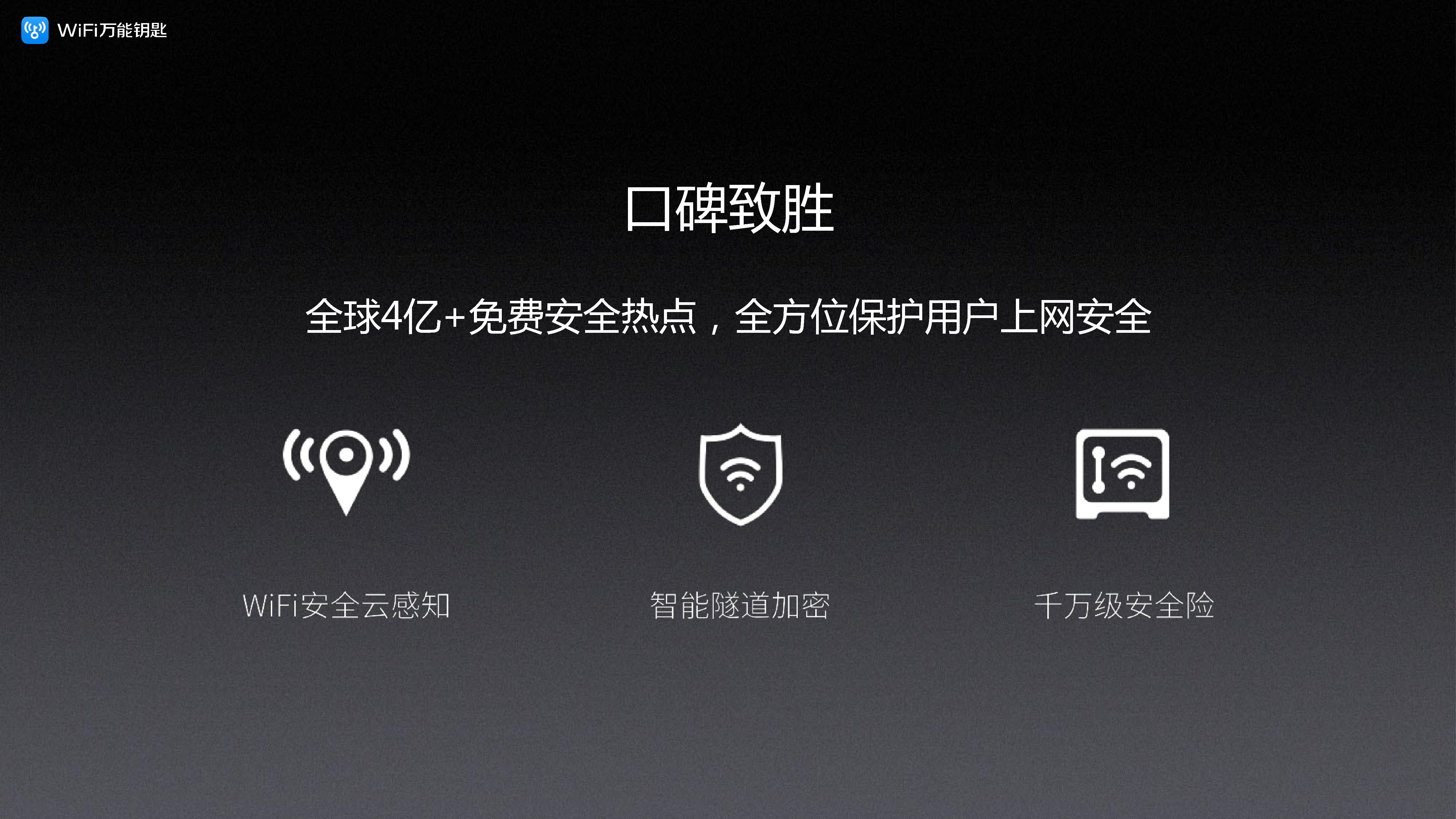 简单介绍一下WiFi万能钥匙的阶段性成果:截止到2016年6月份总用户量达到9亿,月活跃用户数5.2亿,每天连接超过40亿次。这些数据的背后还有一个更值得注意的地方:根据艾瑞、腾讯、猎豹等多家统计结果,WiFi万能钥匙是中国前十大APP中唯一一个非BAT阵营的产品,而且用户量仅次于微信和QQ。